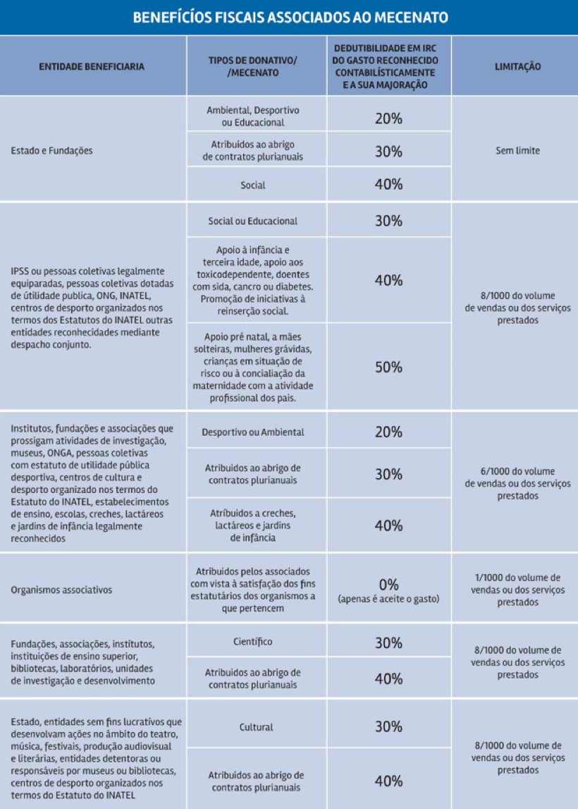Fonte: levantamento efetuado por Renato Carreira, ‘partner’ de tax da Deloitte, para o Saldo Positivo sobre os principais tipos de donativos fiscalmente dedutíveis para efeitos de IRC. (Disponível em http://saldopositivo.cgd.pt/empresas/mecenato-quais-sao-as-vantagens-fiscais-empresa/. Consultado a 03 de janeiro de 2018).